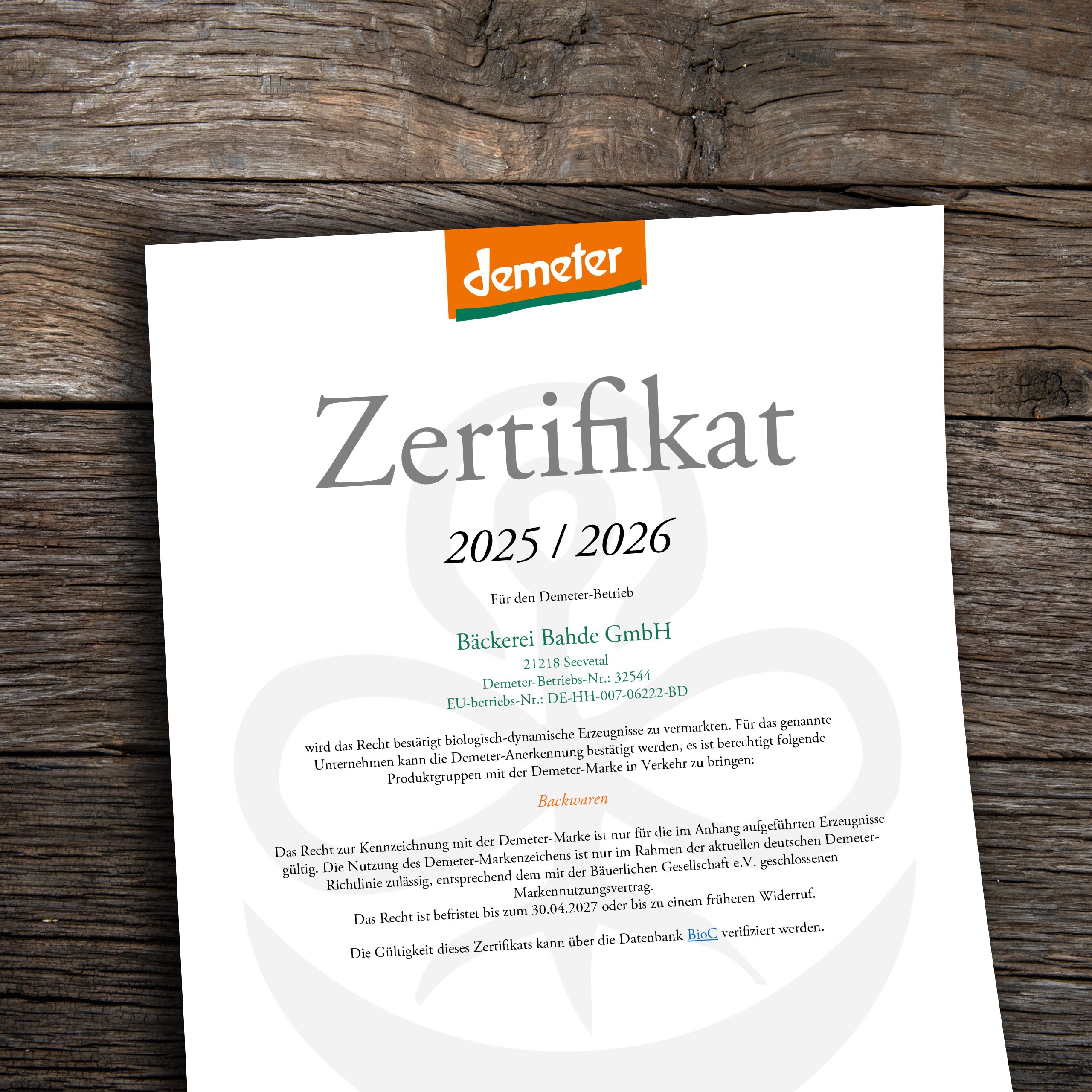Seit über 30 Jahren hat sich die Bäckerei Bahde der Demeter-Landwirtschaft verschrieben. Das heißt für Sie, dass Sie Tag für Tag unser bekömmliches Brot mit Zutaten aus biologisch-dynamischen Anbau genießen können. Für uns ergibt sich daraus die spannende Aufgabe, unseren hohen Ansprüchen immer wieder aufs Neue gerecht zu werden. Eine Herausforderung, die uns anscheinend gut gelingt, wie die folgenden Zertifikate bestätigen.